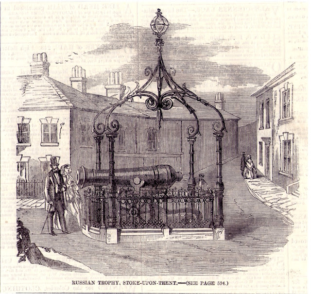 The Victoria History of Staffordshire notes that a Russian cannon was presented to the town by W. T. Copeland in 1857 and erected opposite the Wheatsheaf Hotel in 1858, as per Lodge’s memoirs. In 1858, the Illustrated London News carried an interesting illustration of what was called Stoke-upon-Trent’s ‘Russian trophy’, along with some background information.