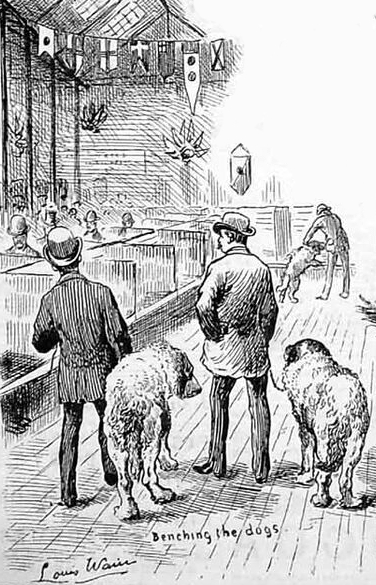 Another of Wain’s illustrations showed that once in the market hall the various dogs were housed in a series of pens ready for the viewing of the general public and while they waited on the judges to do their rounds. There were a few problems. A reviewer in the same paper that carried Wain’s illustrations noted that quite a few of the dogs on show still bore evidence of a mange epidemic that had recently swept the country. Most were over the disease and the worst effects they showed were rather patchy coats, but a few displayed signs that their condition was still ‘alive’, much to the reviewer’s alarm. The entry of such obviously infected dogs he put down to the laxness of the ‘honorary veterinary surgeon’ and the inconsiderate nature of some owners. This was all the more surprising as one of the Kennel Club’s rules stated quite forcefully that no dog suffering from mange or any other infectious disease would be allowed to compete or be entitled to receive a prize.