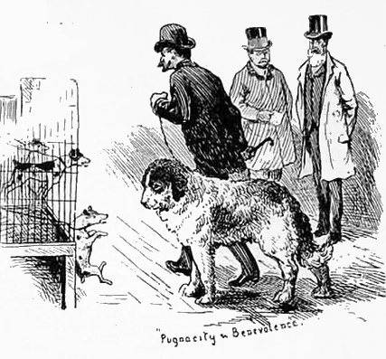 The writer also suggested that the chains holding the dogs in their pens were in many cases far too long. Some of the dogs were fierce or excitable and in their frenzy apt to fall over the edge of their bench and with the smaller dogs in danger of hanging themselves. Wain illustrated the point with a picture showing a placid St Bernard face to face with a group of irate terriers, one of whom had taken just such a tumble and was in danger of throttling itself. The long chains also allowed more mischief as some of the animals were able to get around the partitions and engage in scraps with their surprised neighbours.